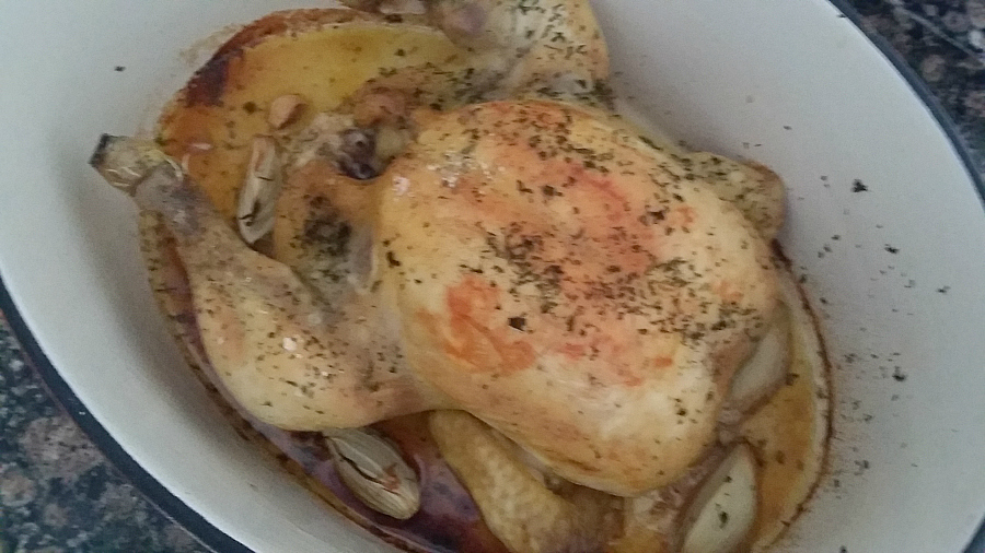 6. Dependiendo del tamaño del pollo, lo dejamos aproximadamente de 1 hora y media a 2 horas a 180ºC, podemos ir pinchando con una brocheta metálica para ver cuándo está tierno.