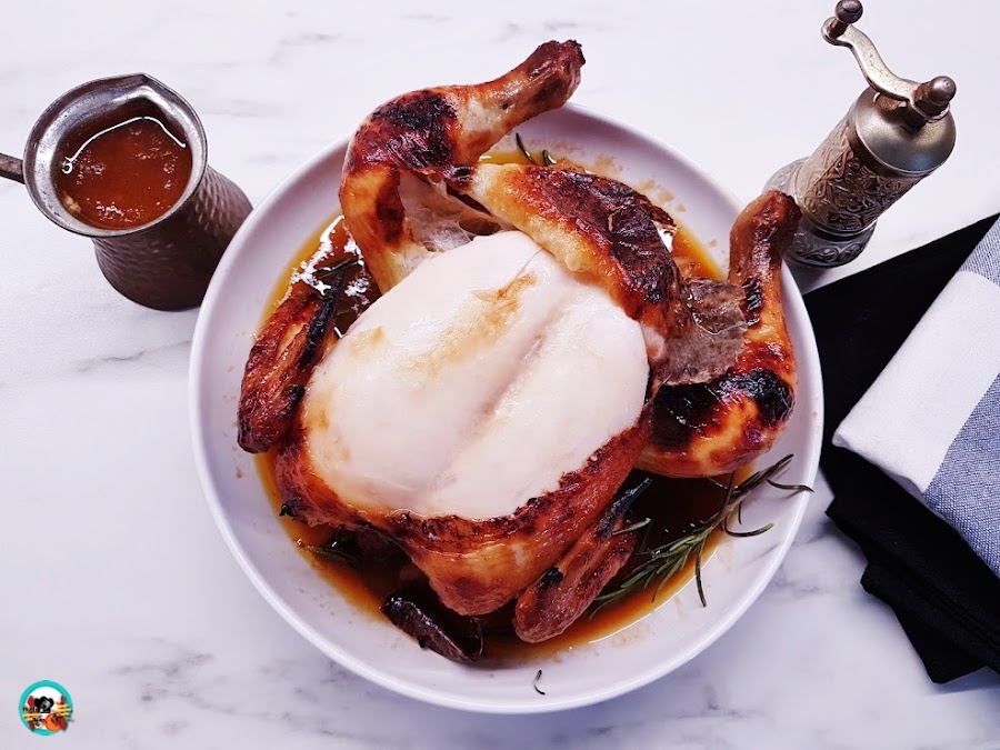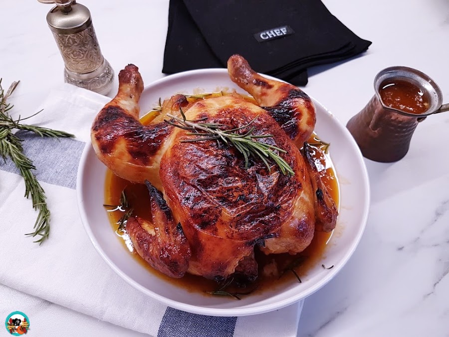 1.- Mezclamos todo los ingredientes de la receta en un bol y con la ayuda de una varilla de mano. Untamos el pollo limpio con la mezcla, lo guardamos en la nevera dejando que se amarece durante toda la noche. Retiramos el pollo glaseado de la nevera 1 hora antes.
