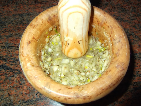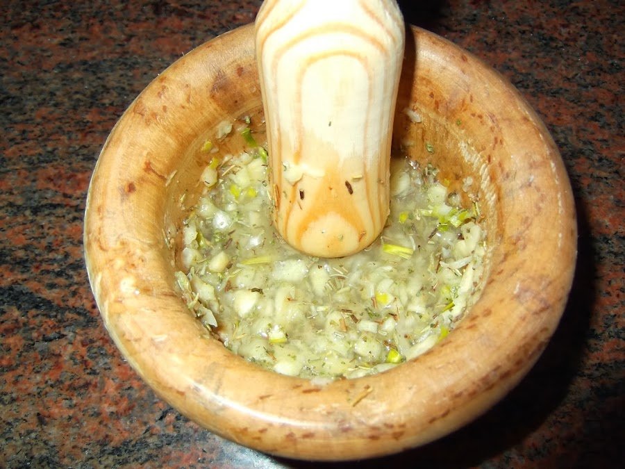 Cuando haya pasado una hora le damos la vuelta y comenzamos a preparar un rico ajilimoje partiendo en trocitos pequeños el ajo y el perejil, lo machacamos en el mortero y le añadimos un chorro generoso de vinagre y la otra mitad del vaso de vino blanco.