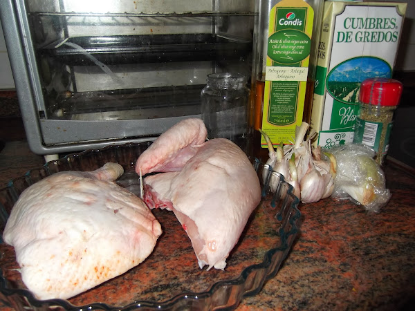 Colocamos el pollo en una fuente apta para horno y precalentamos el horno a 200º. Le echamos por encima el chorro de aceite y medio vaso de vino blanco y lo metemos al horno.