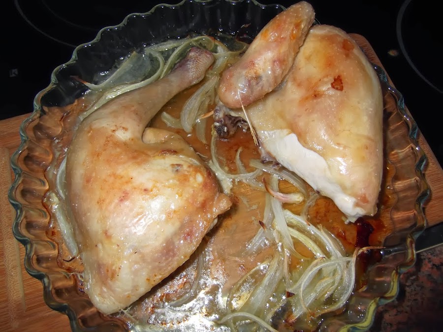 Además, partimos la cebolla en juliana y la colocamos en la bandeja. Cuando haya pasado otra media hora desde que hemos abierto el horno u hora y media desde que lo pusimos, sacamos el pollo y le echamos la cebolla y la mezcla que tenemos en el mortero.