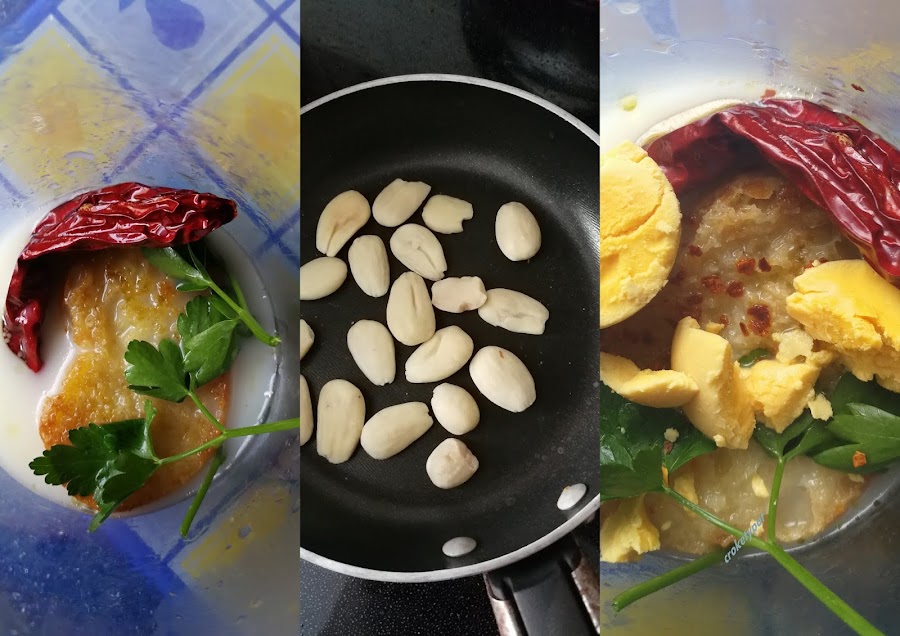 En una olla pondremos aceite, un ajo y el pimiento choricero, lo doramos y se pasa al vaso de la batidora. Coceremos un huevo mientras. Luego le añadimos las almendras tostadas, una rama de perejil, unos copos de chile y una yema de huevo, trituramos con un poco de caldo.