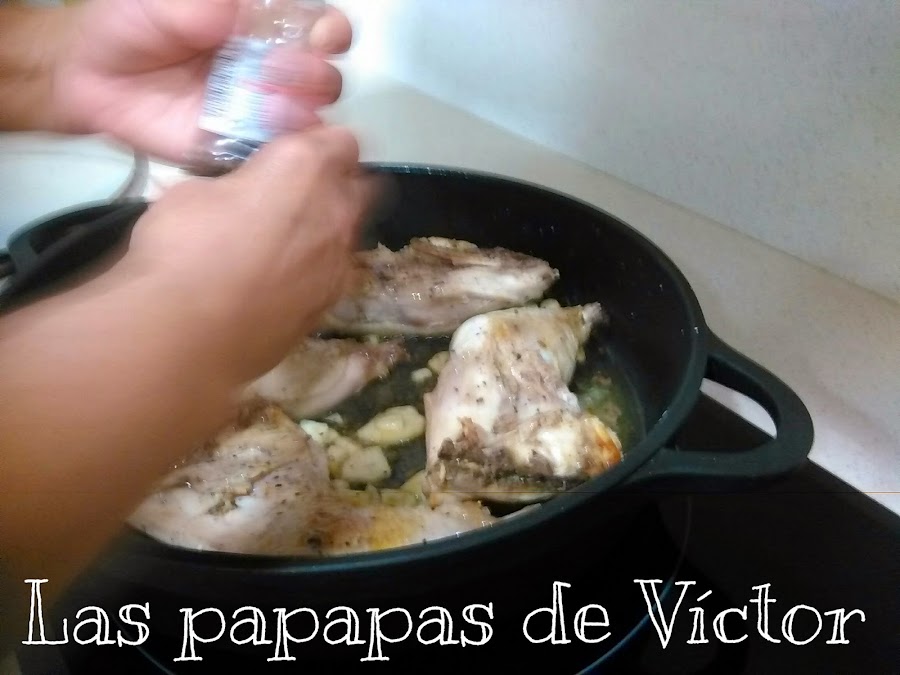 Una vez dorado el pollo añadir el vino blanco, hasta cubrir el pollo