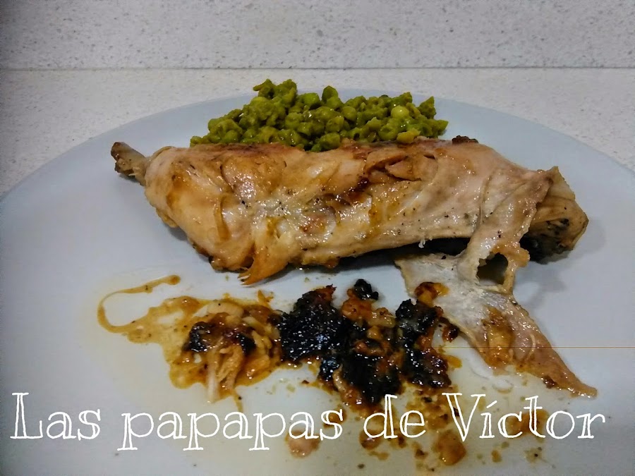 Acompañar el pollo con la salsa y unas verduritas( en este caso guisantes salteados con cebollita)