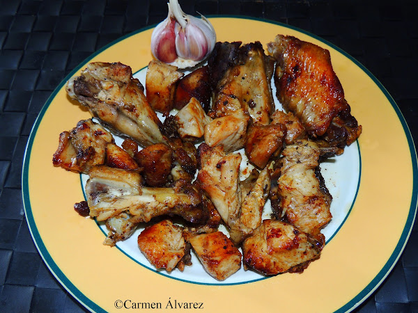 Medio pollo campero. 3 dientes de ajo, aceite de oliva, sal, pimienta y 3/4 de vasito de vinagre de vino. (Si os gusta el sabor, echadle el vaso entero).