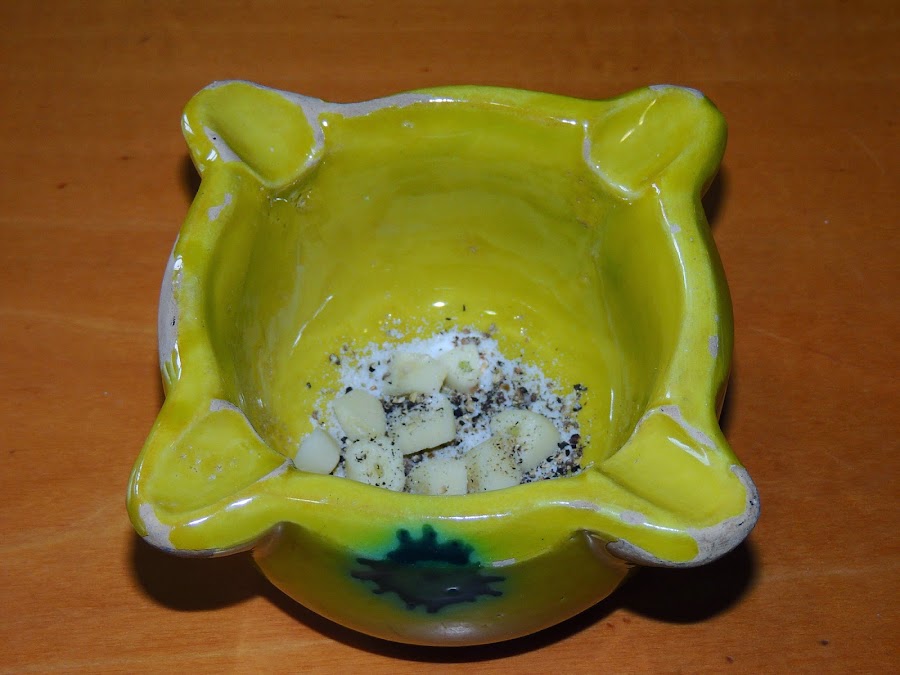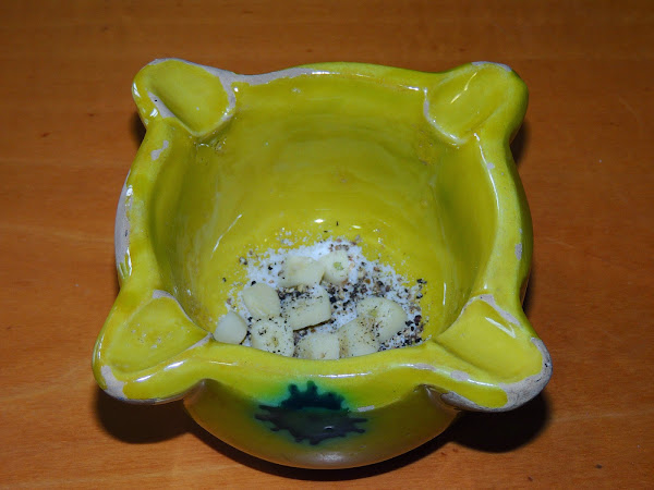 Mientras tanto, se pelan los ajos, se ponen en un mortero y se machacan junto con la sal y la pimienta.