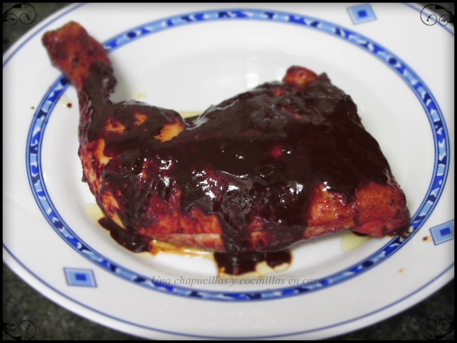 Calentar el horno a 180º C, poner los muslos en una fuente para horno. Reservar alguna cucharada de la marinada para ir echándole por encima de los muslos mientras se hornea.