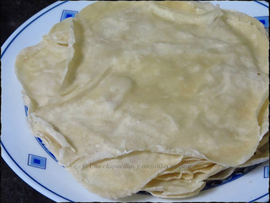 Lo ideal sería hacerlas al vapor (se me ha estropeado la vaporera :_( ) aplanando con el rodillo cada porción hasta que se transparenten nuestros dedos por debajo e ir cocinándolas al vapor, pero para los que no tengáis vaporera esta opción también es válida.
