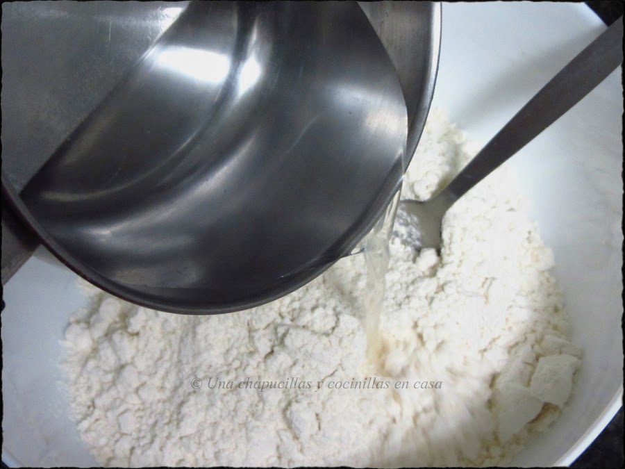 Una vez que ha roto a hervir, verter poco a poco el agua en un bol con la harina.