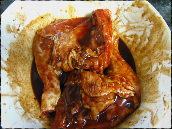 Macerar bien los muslos de pollo, taparlo con film transparente y dejarlo reposar en la nevera al menos 2 horas.