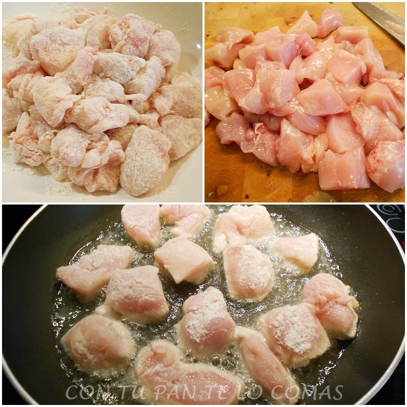 1. Cortar las pechugas en dados, salar y rebozar en harina quitando el exceso para que sólo tenga una capa finita.