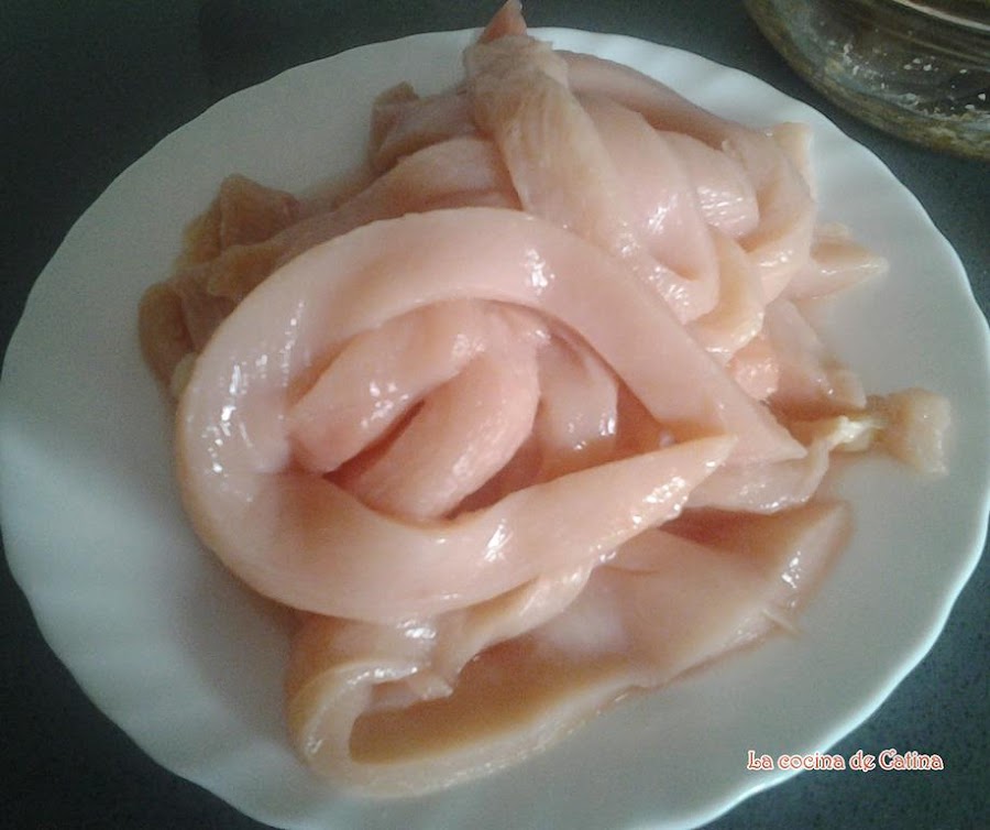 Cortar las pechugas, el pimiento rojo y la cebolla en tiras finas.