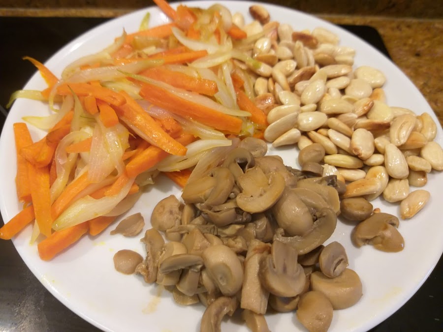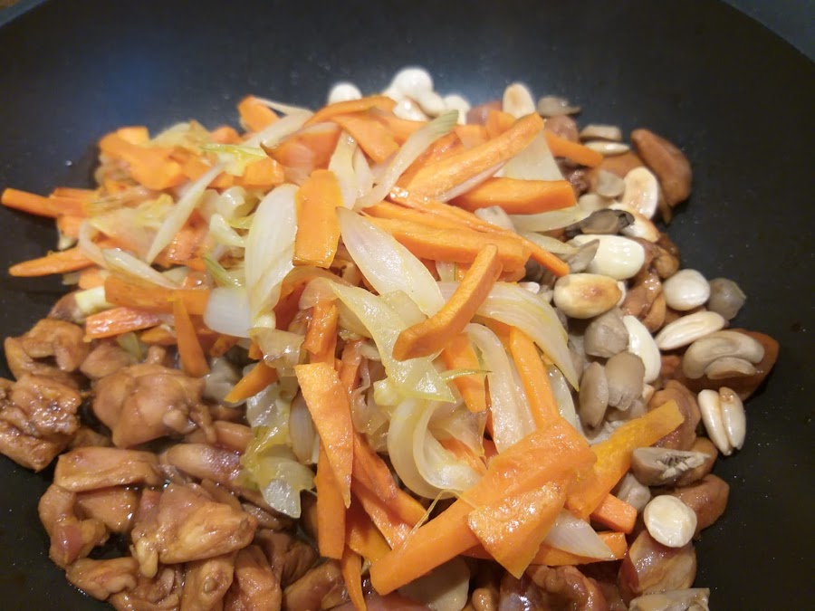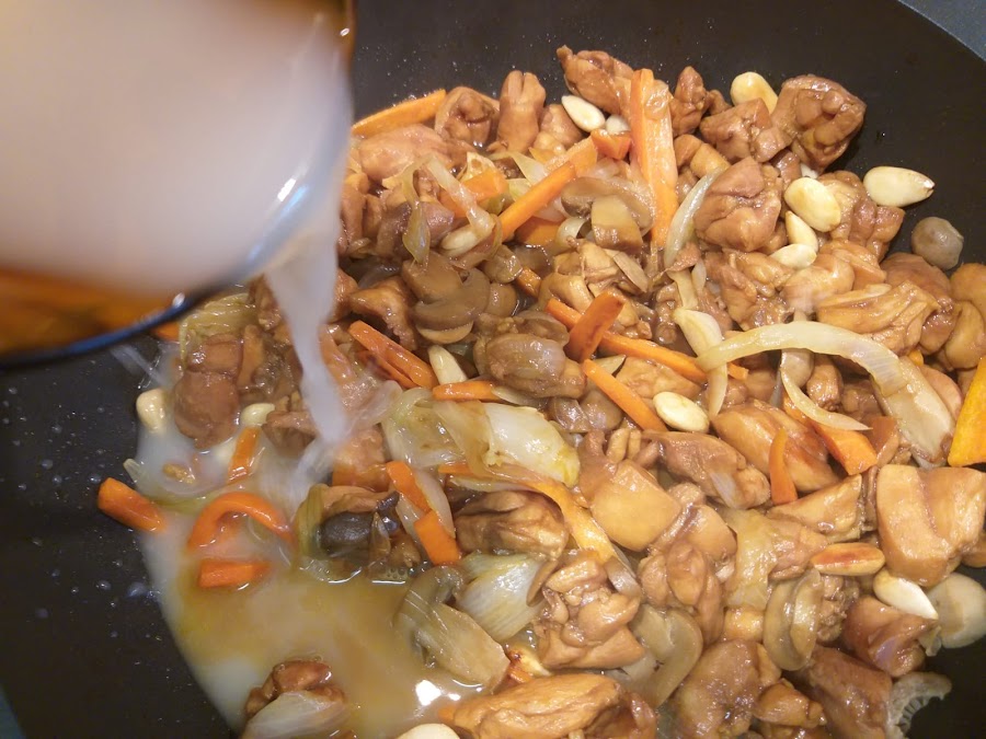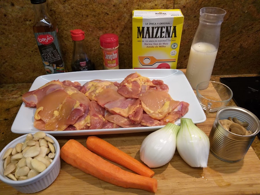3/4 de pollo deshuesados, 100 gr de almendras crudas, 2 zanahorias, 2 cebolletas o 1 cebolla grande, 1 calabacín(opcional), 250 ml caldo de pollo, 100 ml de salsa de soja, 1 cucharadita de jengibre en polvo, 1 cucharadita de azúcar moreno, 1 cucharada sopera de maizena, aceite de sésamo o girasol y champiñones.