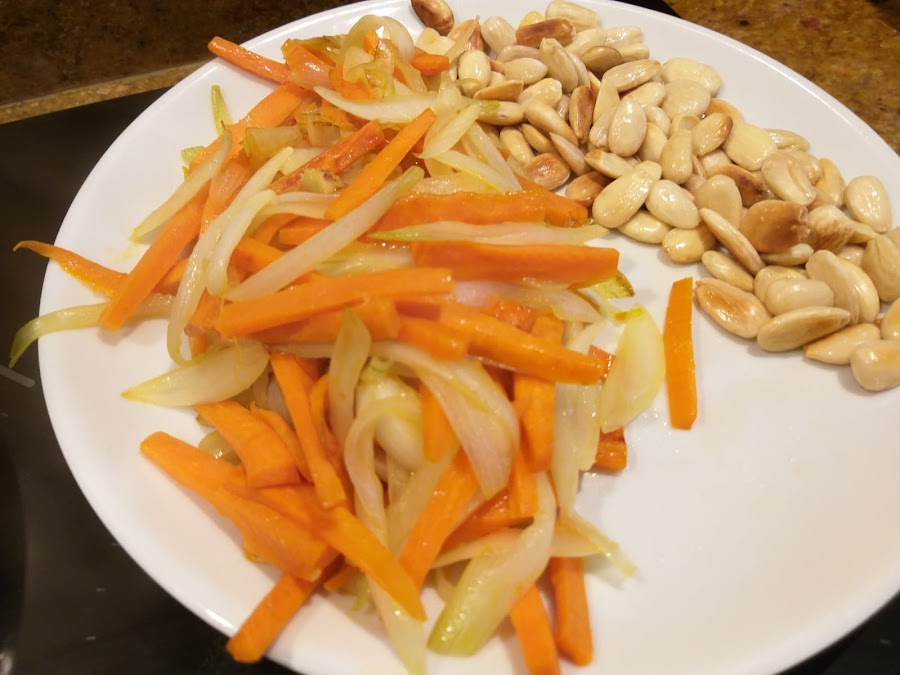 Echamos un poquito más de aceite de sésamo y rehogamos la zanahoria y la cebolla cortadas en juliana durante 5 a 7 minutos con un poco de sal.