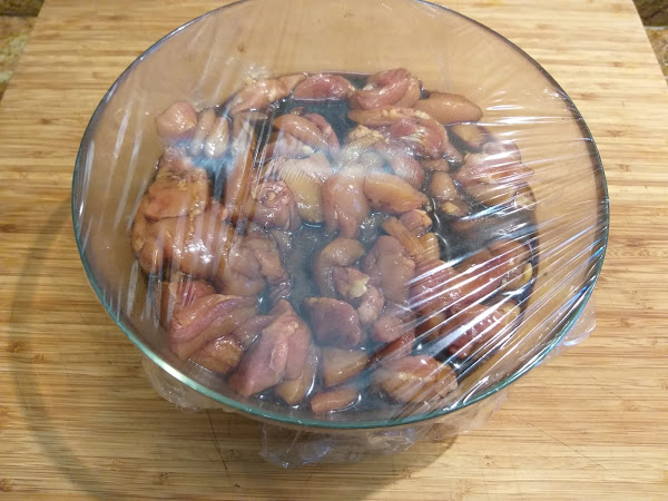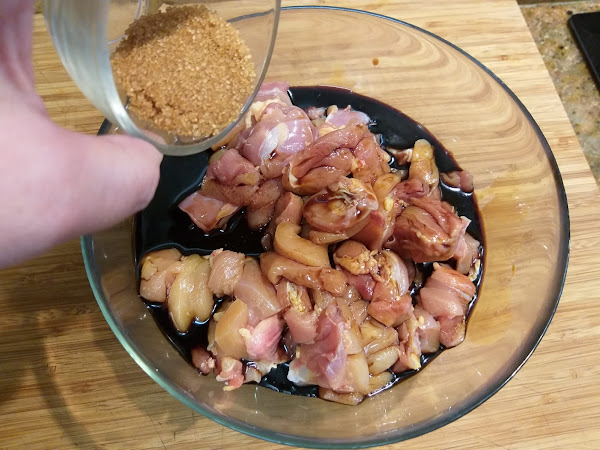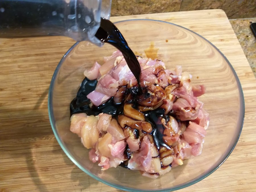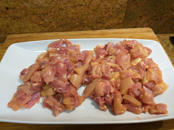 Empezamos troceando el pollo ya deshuesado en trocitos pequeños.