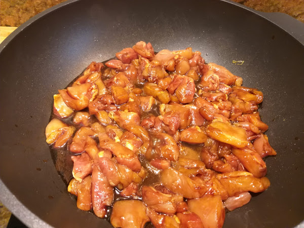 En el mismo wok saltear el pollo durante 5 minutos, junto con el jugo de la maceración y sin dejar que se dore.