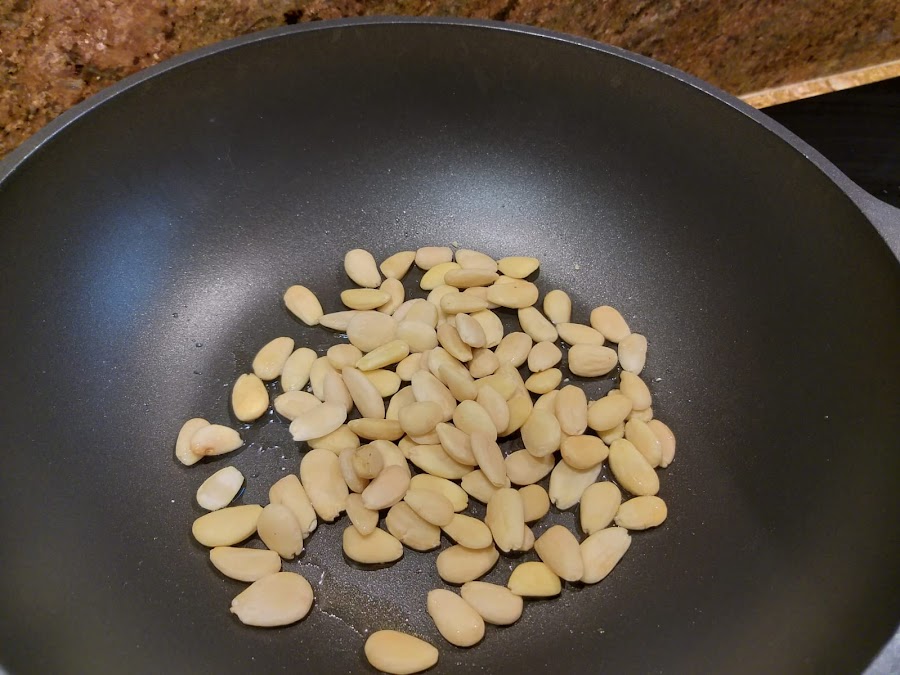 Echamos unas gotas de aceite de sésamo a un wok y doramos las almendras .