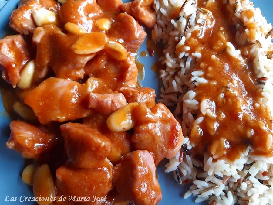 Ponemos el aceite en una sartén y freímos el pollo. Lo sacamos y lo reservamos. En el mismo aceite freímos la cebolla, solo un poco y añadimos las almendras, removemos un poco y echamos el pollo, junto con el ketchup, la soja, el vino blanco y la harina de arroz deludía en agua. Dejamos cocer unos 5 minutos y ya estaría listo. Yo lo acompañe con arroz y eche un poco de la salsa por encima, lo vereis en la ultima foto.