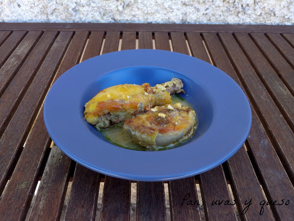 Pelamos la cebolla y la picamos. En el mismo aceite donde hemos frito el pollo rehogamos la cebolla picada, cuando esté dorada añadimos el ajo picado y el azafrán. Echamos esto sobre el pollo y añadimos agua y lo cocinamos a fuego lento hasta que esté tierno.