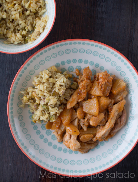 Esta muy rica, a nosotros nos ha encantado, y queda perfecta acompañada de un arroz blanco, arroz tres delicias o este arroz exótico que veis en las fotos, la receta la publicaré la próxima semana porque la verdad, es el acompañamiento perfecto.