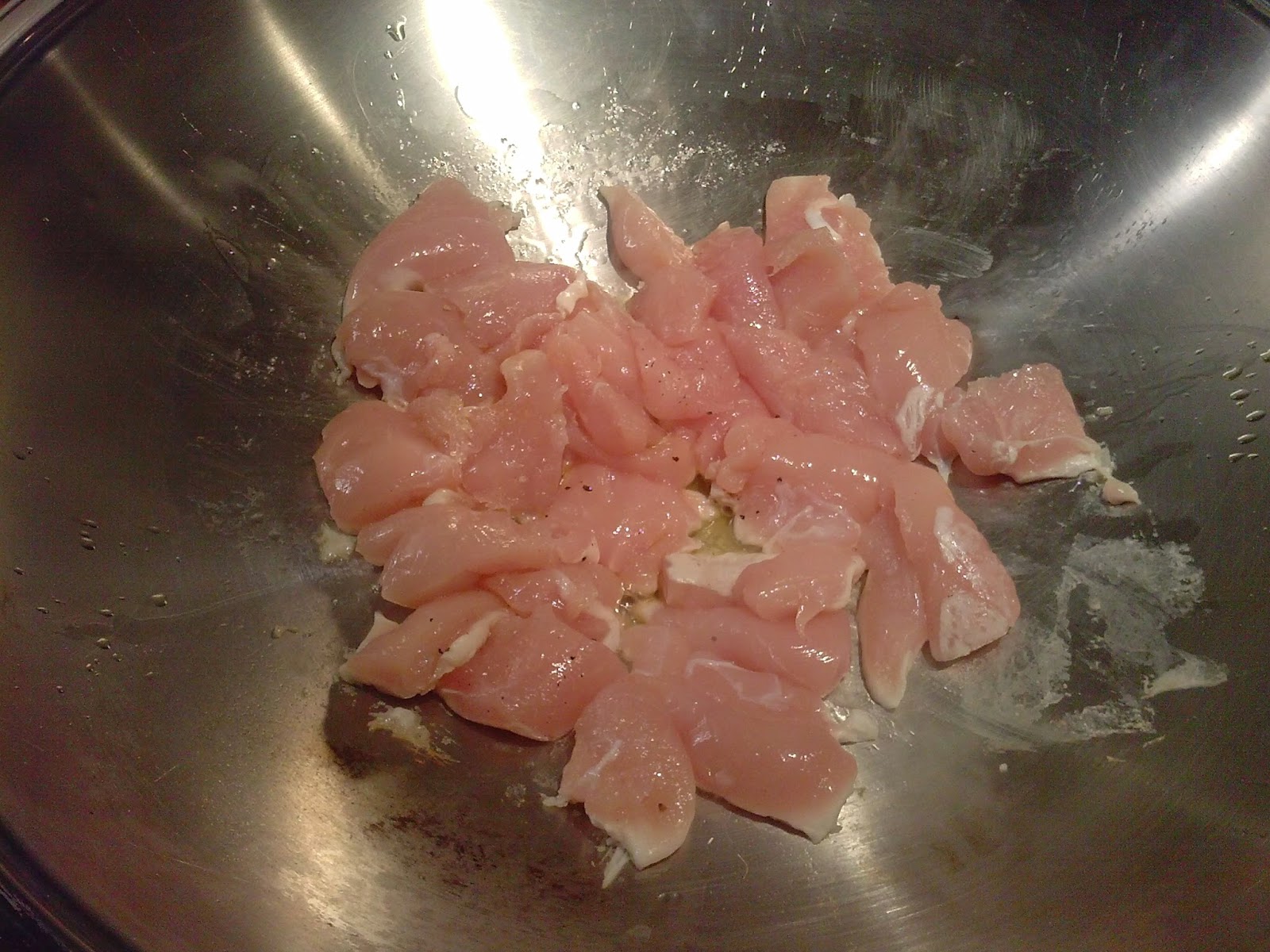 Lo primero va a ser saltear el pollo. Si es en un wok no vamos a usar nada de aceite, en caso contrario unas gotitas. Salpimentamos y cocinamos hasta tenerlo dorado por todos sitios. En ese momento añadimos las almendras y las verduras. Vamos a cocinarlas unos minutos todo junto y añadiremos la harina y el vaso de caldo. Me ha sobrado un poco de repollo de los rollitos, así que también se lo he puesto.