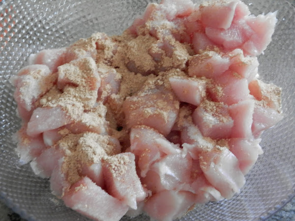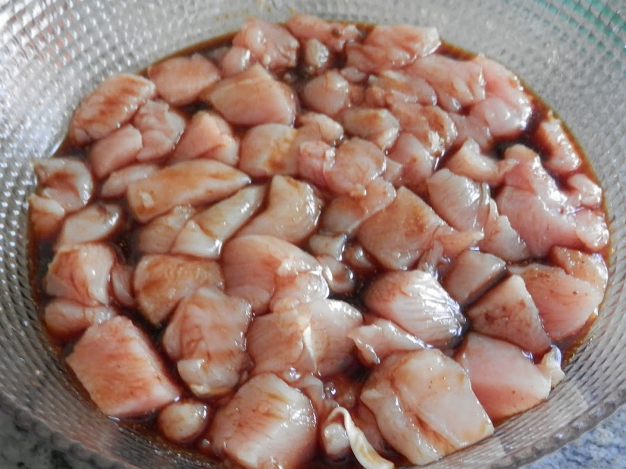 Cortamos las pechugas en trozos pequeños y las meteremos en el líquido que hemos preparado anteriormente.