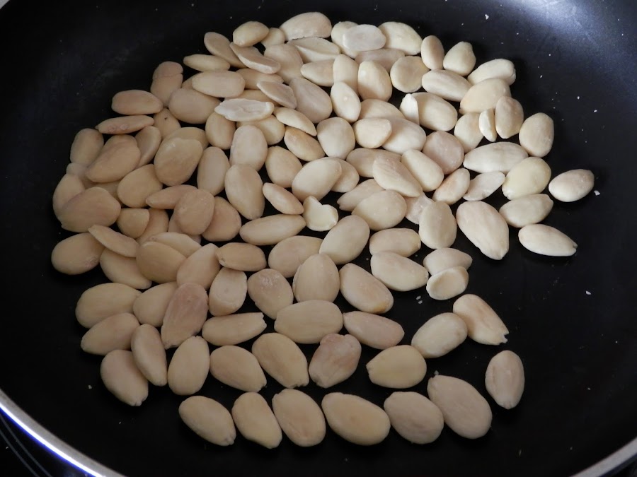 Mientras se macera el pollo, vamos a tostar las almendras en la sartén y una vez tostadas, las reservamos.