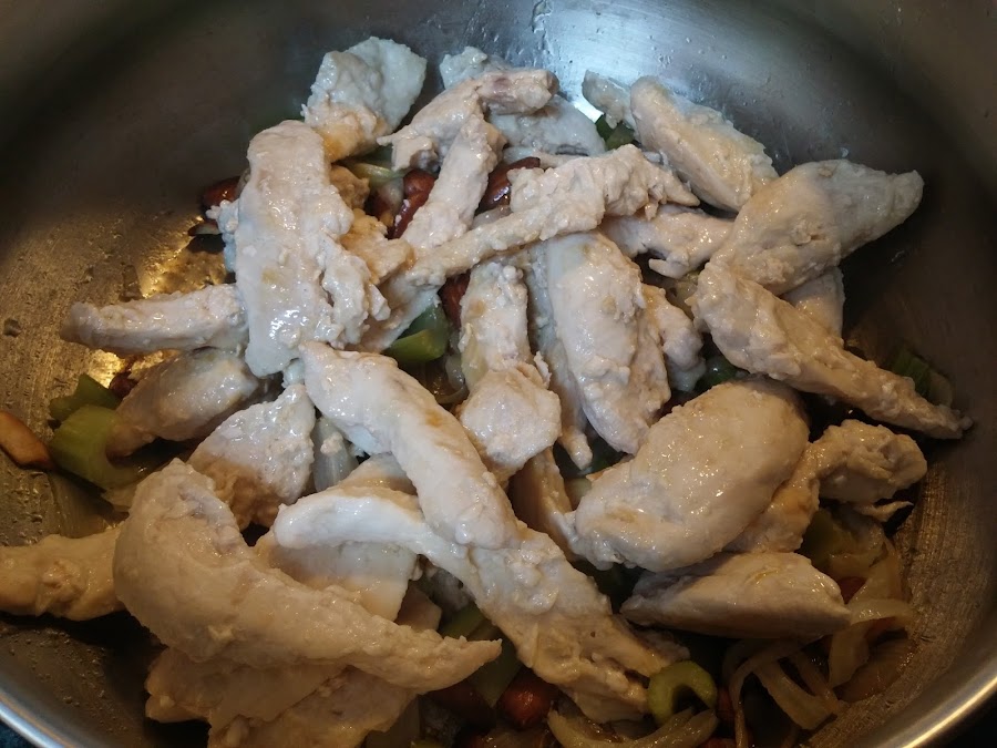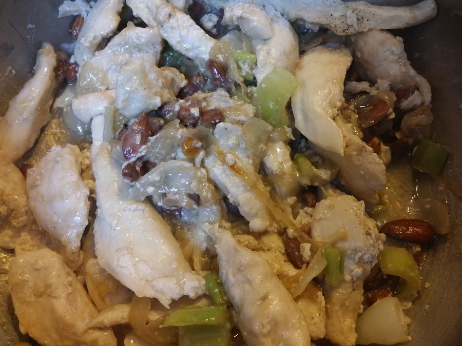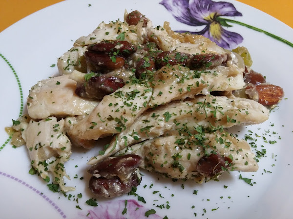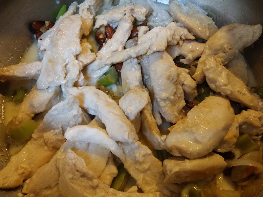 Disolvemos la maicena en el caldo restante y lo vertemos sobre el pollo.