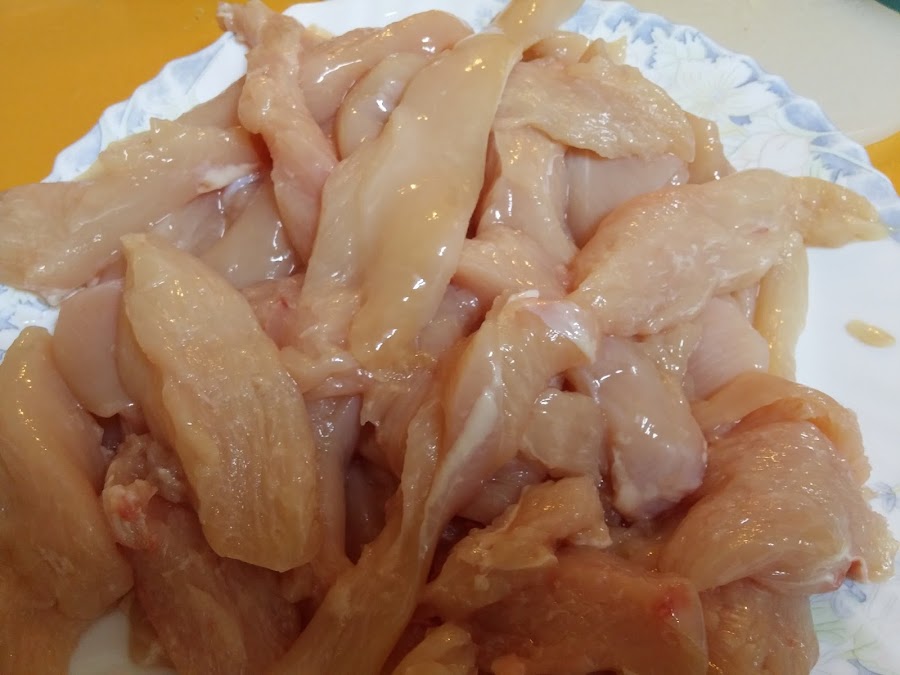 A continuación vamos a cortar la pechuga de pollo en tiras.