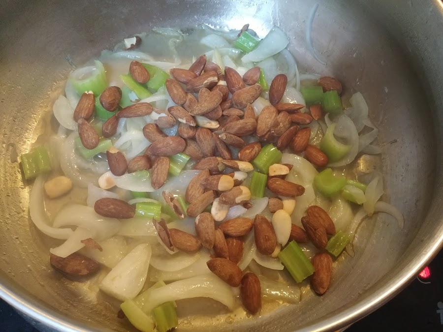 Cuando veamos que están blandos, añadimos las almendras y unas cuatro cucharadas del caldo de verduras. Dejamos unos 5 minutos.