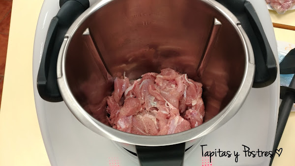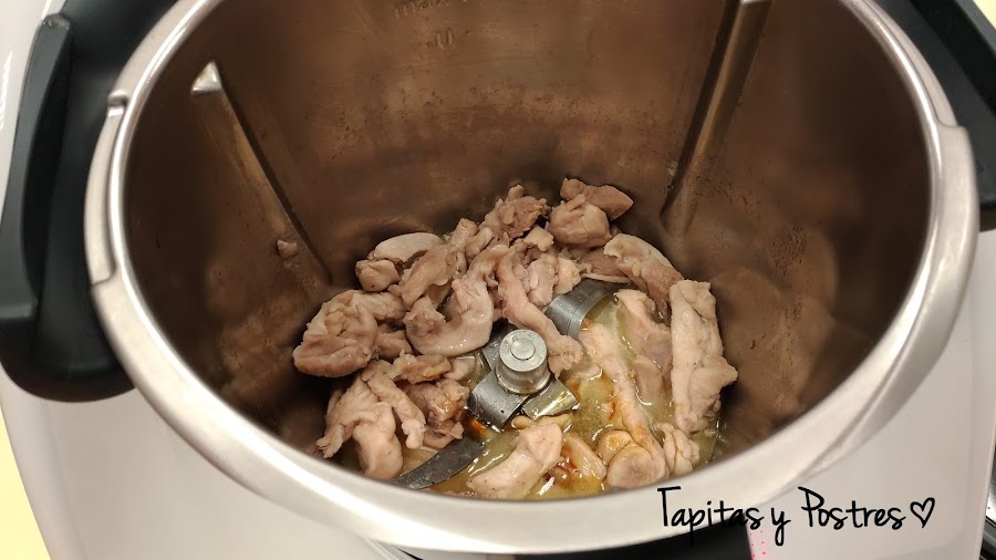 Añadimos el pollo en tiras y la sal y la pimienta, removemos con la espátula y cocinamos 10 minutos, varoma (o 120º en la Thermomix 5), giro a la izquierda y velocidad cuchara.