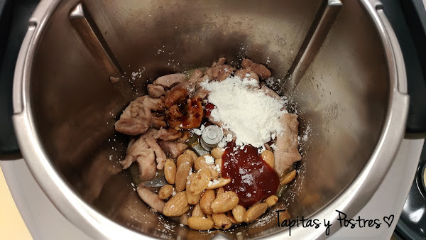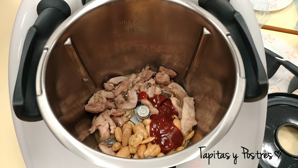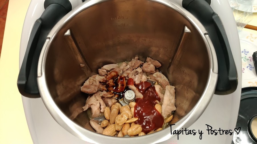 Al acabar, agregamos las almendras, el ketchup, caramelo liquido, salsa de soja, salsa Perrins y maicena. Removemos con la espátula y programamos 5 minutos, varoma (120º en la TH5), giro a la izquierda y velocidad cuchara. Listo.