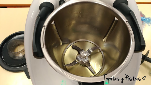 Calentamos el aceite cinco minutos, varoma (o 120º, en la thermomix 5) y velocidad 1.