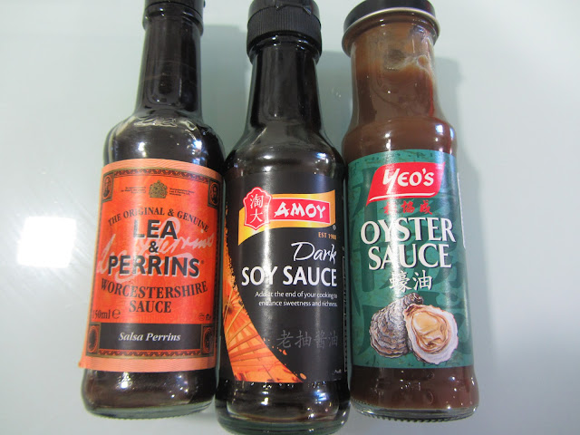 Pero, como aquí no encontré, pues me tocó acudir a San Google para buscar un sustitutivo. Y varios foros coincidían en que se podía reemplazar por salsa Worcestershire (la "salsa Perrins" de toda la vida). Por lo tanto, eso es lo que hice.