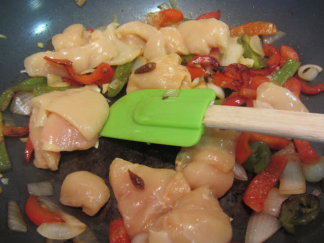 ...y, cuando empiece a dorarse, añadimos el pollo y las guindillas.