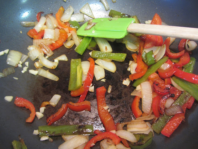 En un wok o sartén honda, calentamos el aceite (un chorrito, no más de 2 cucharadas), y salteamos los pimientos, primero a fuego más vivo y después con fuego algo más bajo y poniendo la tapadera).