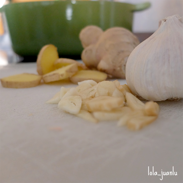 Lo primero que hacemos es preparar los ingredientes y utensilios. Cortamos el jengibre, el ajo y el chile (sin semillas) en rodajas. Ponemos al fuego una olla o cazuela, si es baja mejor, donde añadimos los ingredientes que hemos cortado junto con el caldo.