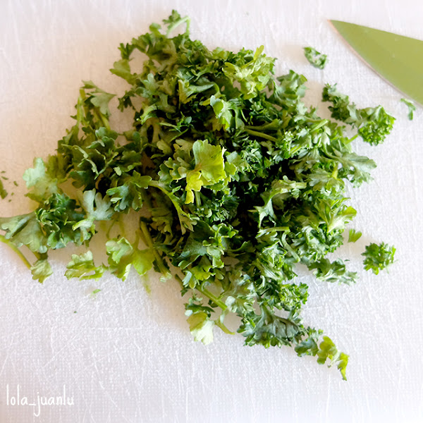 Mientras, cortamos las cebolletas en tiras muy finas y reservamos. Picamos el cilantro o perejil y reservamos también.