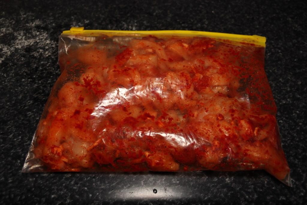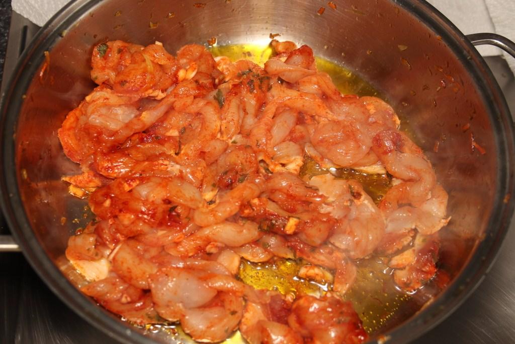 Troceamos muy finamente los ajos y el perejil, pasamos a una bolsa de plástico con cierre “zip” (o una bolsa normal que cerraremos con un nudo), metemos el pollo en tiras finas y el pimentón. Cerramos la bolsa y agitamos bien para que se impregne bien el pollo de todos los ingredientes. Reservamos.