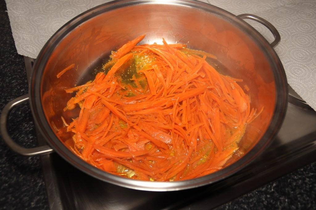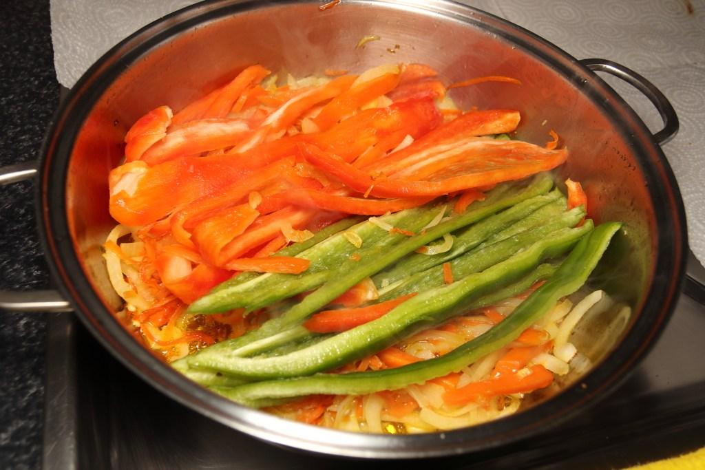 En una cazuela baja y amplia vertemos un buen chorro de aceite de oliva, llevamos al fuego e incorporamos la zanahoria, que re rehogue bien, añadimos los pimientos y la cebolla, que se dore bien todo.