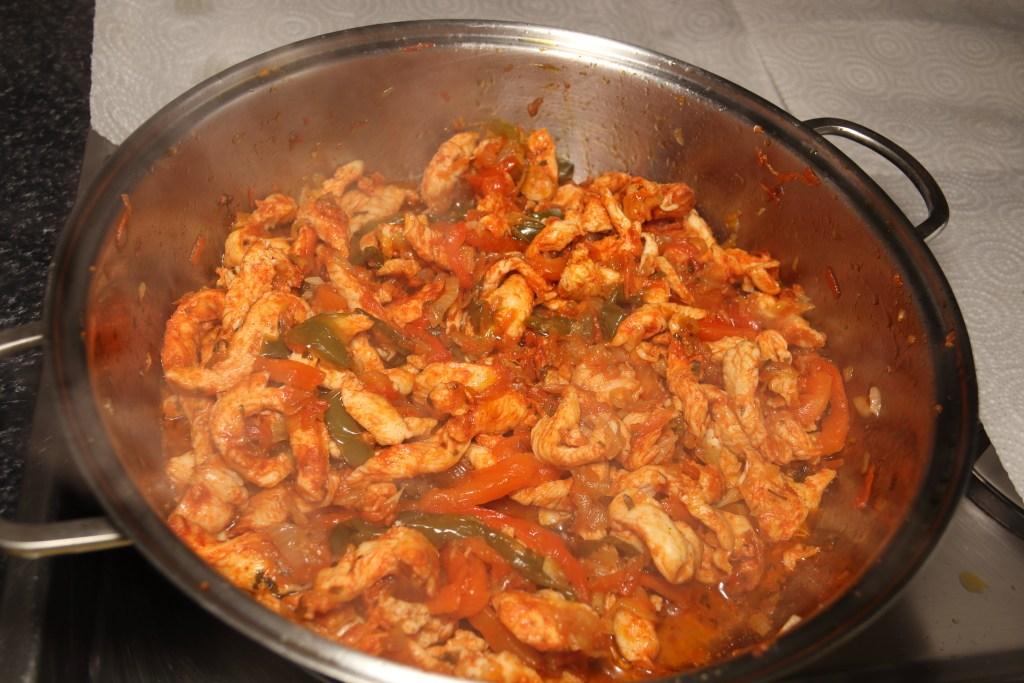 El pollo, si lo compramos en carnicería nos lo preparan a nuestro gusto, si lo comparamos en un hipermercado, lo compraremos en filetes y lo hacemos tiras finas nosotros en casa, sazonamos y reservamos.