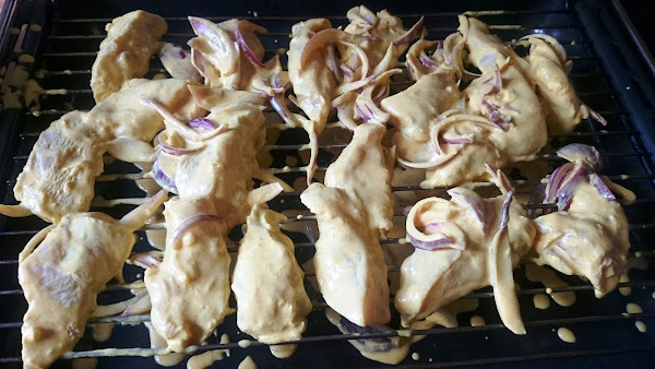 Una vez que el pollo esté marinado, precalentamos el horno o el grill al máximo. Forramos una bandeja de horno con papel antiadherente.
