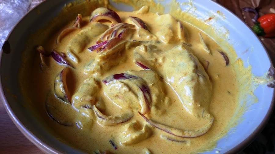 Echamos en una ensaladera las cebollas, el zumo de limón, el aceite, la cúrcuma. el yogur y la sal gruesa y mezclamos bien. Majamos el azafrán en un mortero y a continuación vertemos encima el agua hirviendo, para dejar en infusión entre 5 y 10 minutos