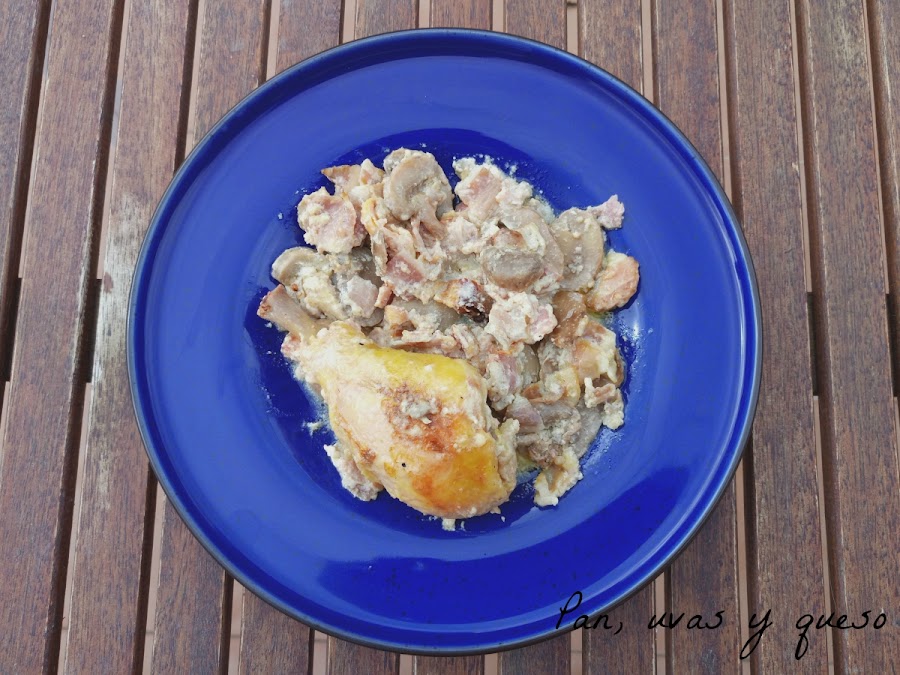 Una vez que hemos terminado de dorar el pollo, echamos en la sartén el bacon y los champiñones. Cuando el baconempiece a tomar color añadimos la nata (crema de leche) y el queso rallado y dejamos que de un hervor.