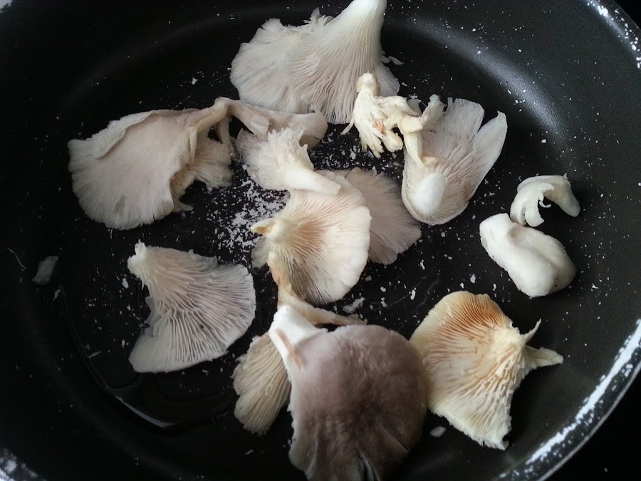 1. - Primero pondremos las setas en una sartén amplia con las dos cucharadas de aceite de almendras y las vamos salteando.