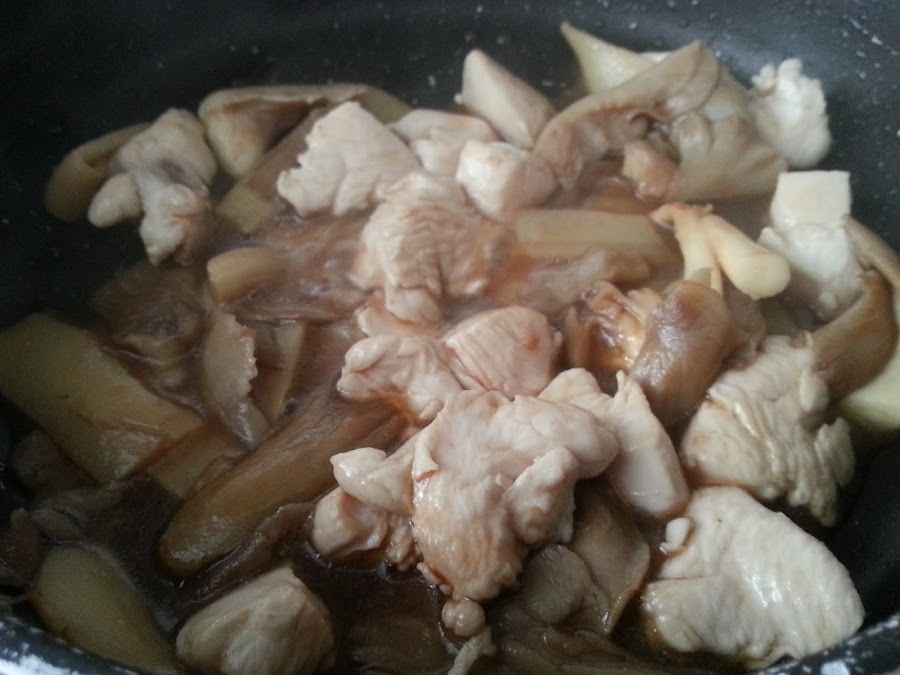 5. - Cuando veamos que ya está todo el pollo hecho por todos lados, le añadimos la salsa de soja y la salsa de otras, removemos bien y dejamos unos 5 minutos más.