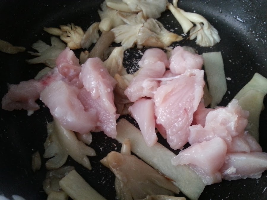 4. - Le agregamos el pollos troceado y removemos bien, que el pollo se vaya haciendo por todos lados.