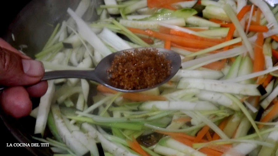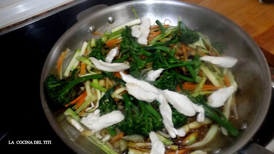 3º En donde mismo marcamos el pollo pochamos la verdura menos los bimis y todas ellas cortadas en finas julianas