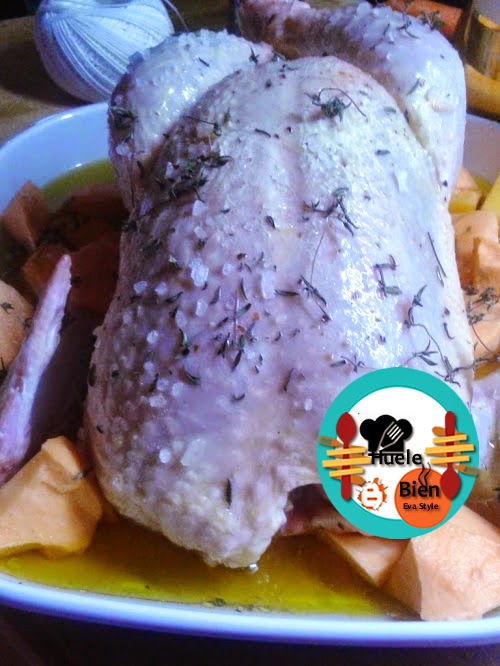 Para disfrutar de una buena comida, un día de celebración con los familiares y amigos no es necesario gastar mucho dinero, ni comprar productos caros. Anoche cuando llegue a casa cocine este exquisito pollo con calabaza, batata y tomillo.