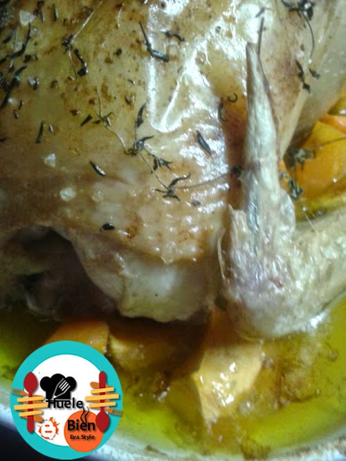 1.- Limpiamos bien el pollo, le quitamos las vísceras. Lo lavamos y secamos por fuera con papel de cocina. Lo untamos con margarina, salpimentamos, le añadimos las ramitas de tomillo.